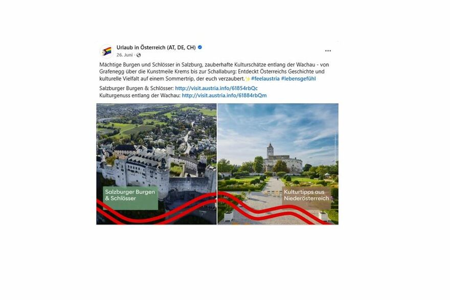 Wir präsentieren Ihre Inhalte 3 Monate lang innerhalb eines Teasers auf den deutschsprachigen Portalen der austria.info. Ihre Seite wird in allen 3 DACH-Märkten im offiziellen Newsletter der Marke Urlaub in Österreich sowie in einem Facebook Posting direkt beworben.