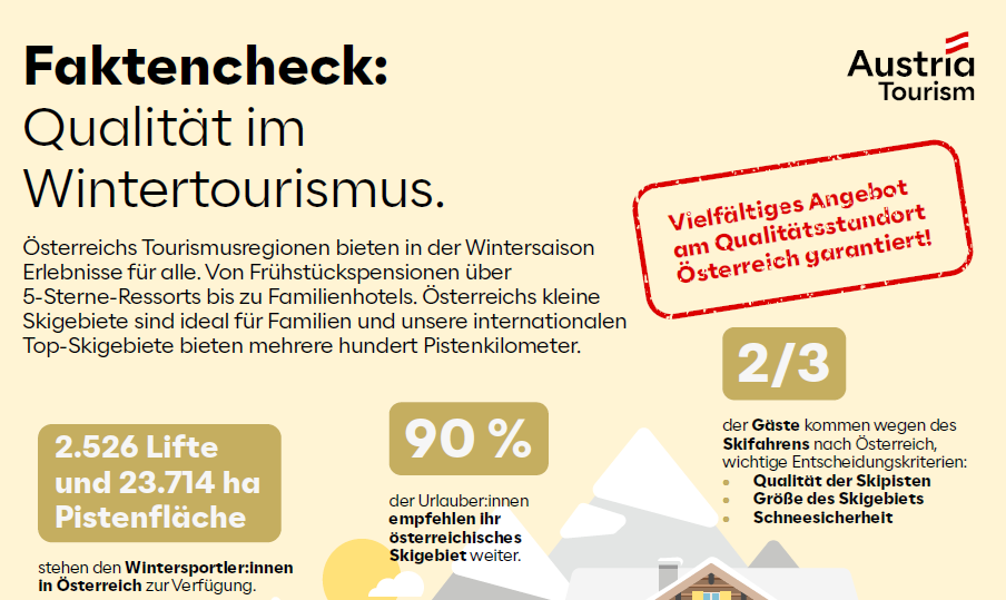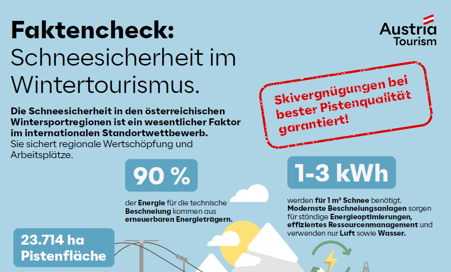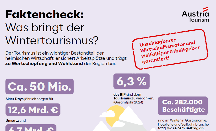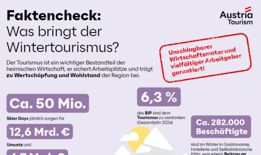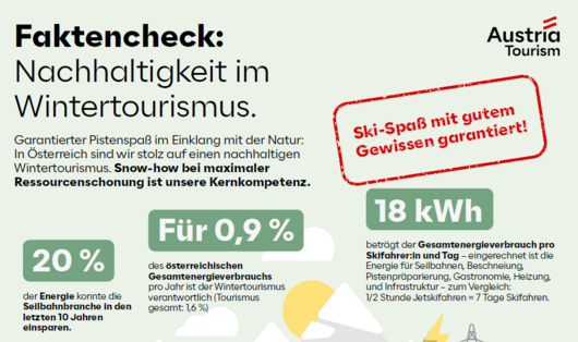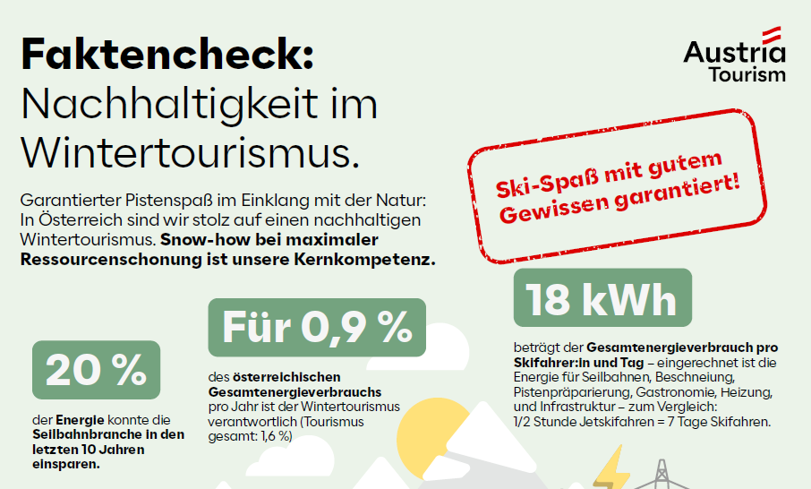 Wie viele Skilifte gibt es in Österreich? Wie viel Energie benötigt der Wintertourismus? Und wie viel Wertschöpfung generiert er? Hier finden Sie Factsheets mit diesen und weiteren spannenden Fakten rund um den Wintertourismus in Österreich. Egal, ob Betrieb oder Region: Nutzen Sie die Factsheets gerne für Ihre Kommunikation!